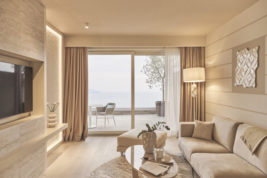 Die 96 Suiten öffnen sich mit weiten Terrassen zum See. Olivenholz, heller Marmor und zurückhaltende Farben schaffen eine Atmosphäre zeitloser Eleganz. Ergänzt wird das Angebot durch Sky Pool Villen mit privatem Infinity-Pool und uneingeschränktem Blick auf den Gardasee.