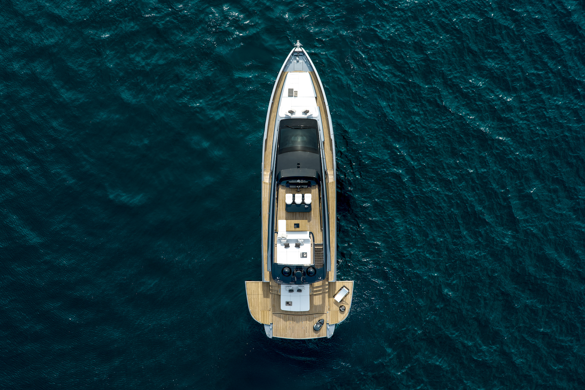 Als kompakteste Yacht der Sport Utility-Reihe überzeugt das jüngste Modell mit einem völlig neuen Raumkonzept, das sowohl innen als auch außen neue Maßstäbe setzt. Premiere feierte die 21,76 Meter lange und 5,42 Meter breite Yacht anlässlich des 40-jährigen Jubiläums der Marke – stilgerecht in den Gewässern vor Capri. Das zweistufige Heckkonzept vereint Beachclub-Feeling und Gesellschaftsbereich. Seitliche Terrassen vergrößern die Badeplattform auf über 23 m2, während eine doppelt bewegliche Plattform den Launch von Tender oder Jetski erleichtert. Der obere Bereich mit C-förmigem Sofa und Esstisch schafft eine nahtlose Verbindung zum Innenraum, in dem sich Küche, Essbereich und Lounge in offener Gestaltung vereinen. Edle Materialien, eine ausgeklügelte LED-Lichtführung und raffinierte Farbakzente sorgen für ein durch und durch elegantes Ambiente.